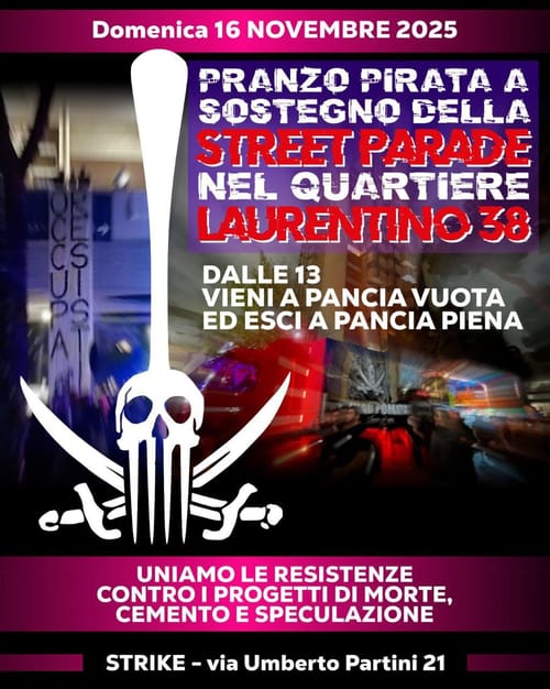 Domenica 16 novembre – Pranzo pirata a Strike a sostegno della street parade nel quartiere Laurentino38 Con il pensiero a chi negli ultimi giorni ha dato vita al rave di Modena e ha difeso uno spazio di libertà, invitiamo tuttx domenica 16 novembre a Strike per un pranzo di autofinanziamento della street parade di quartiere … Leggi tutto "Domenica 16 novembre – Pranzo pirata a Strike a sostegno della street parade nel quartiere Laurentino38"