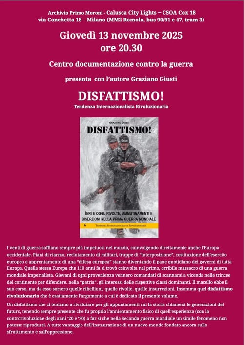 Centro di documentazione contro la guerra - Friday, November 7, 2025english below Archivio Primo Moroni – Calusca City Lights ─ CSOA Cox 18 via Conchetta 18 – Milano (MM2 Romolo, bus 90/91 e 47, tram 3) Giovedì 13 novembre 2025 ore 20.30 Centro documentazione contro la guerra presenta con l’autore Graziano Giusti D I S F A T T I S M O […]