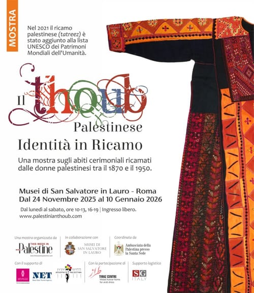Ai Musei di San Salvatore in Lauro (tra via dei Coronari e Lungotevere Tor di Nona) a Roma, dal 24 novembre 2025 al 10 gennaio 2026, si terrà una mostra sugli abiti cerimoniali ricamati delle donne palestinesi, con il supporto di AssopacePalestina.
