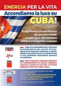 Per questo CGIL Confederazione Generale Italiana del Lavoro, ANPI, Arci e Anaic promuovono la raccolta fondi “Energia per la vita”, destinata a sostenere il sistema elettro-energetico cubano attraverso l’acquisto di attrezzature e pannelli solari.