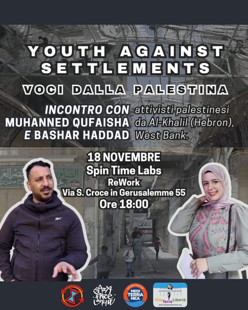 Martedì 18 novembre, ore 18:00 a Spin Time Labs, via S. Croce un Gerusalemme 55, Roma, incontro con attivisti palestinesi di Youth Against Settlements, Hebron.