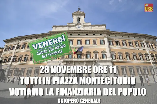 Contropiano - Monday, November 17, 2025Venerdì 28 novembre, in occasione dello sciopero generale, la manifestazione prevista per Roma sarà dalle ore 11.00 a Montecitorio. Nel giorno in cui i parlamentari non lavorano, come tutti i venerdì dell’anno, le lavoratrici e i lavoratori in sciopero votano e approvano la Finanziaria del popolo. Nel giorno dello sciopero […]