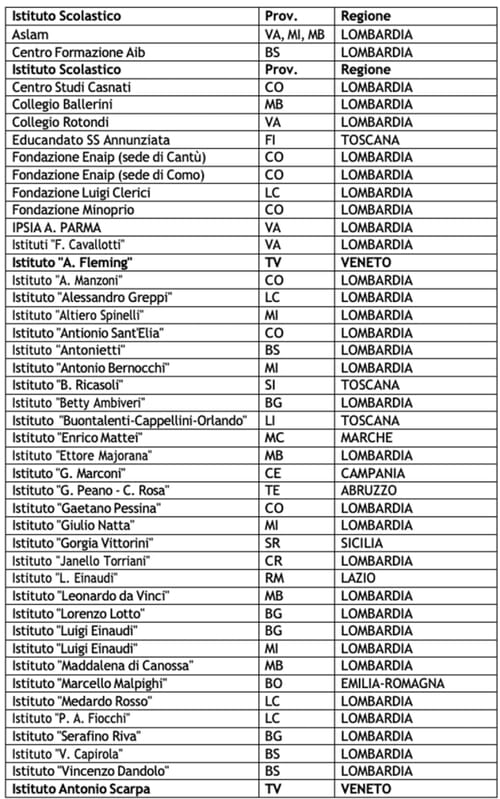Di seguito la tabella riassuntiva delle scuole che hanno finora aderito al progetto, sperando che le adesioni si fermino qui.