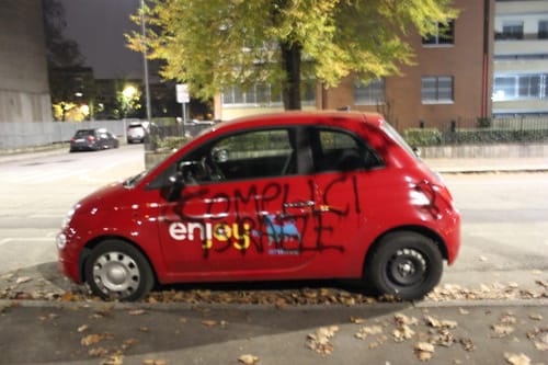 Questa notte a Torino, al riparo dagli occhi indiscreti delle telecamere, abbiamo colpito alcune macchine Fiat 500 di Enjoy, il car sharing di Eni.