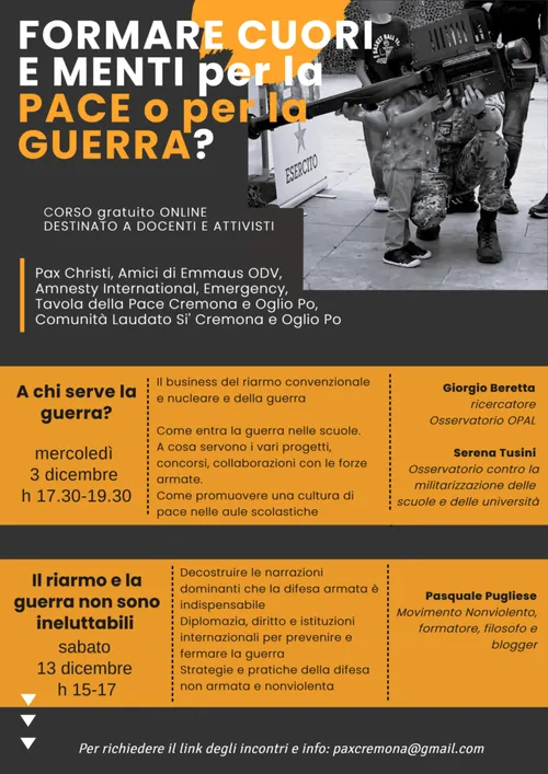 A Cremona una rete di associazioni impegnate per la pace e i Diritti Umani (Pax Christi, Amici di Emmaus ODV, Amnesty International, Emergency, Tavola della Pace Cremona e Oglio Po, Comunità Laudato Si Cremona e Oglio Po) insieme all’Osservatorio contro la militarizzazione delle scuole e delle università propone a insegnanti e attivisti un corso gratuito online di due incontri: partendo dall’analisi del contesto internazionale, si propone di fornire strumenti che aiutino a leggere la complessità e mostrano possibilità differenti e strategie reali per andare oltre il paradigma della guerra.