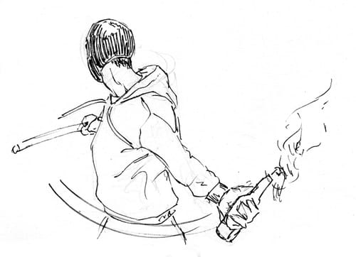 (disegno di lorenzo la rocca)“Cònia, la cui falsa etimologia deriva dal cono, è una scuola che dalla montagna trae alcuni caratteri: rarefazione dell’aria, altezza panoramica, isolamento, distacco. In queste ideali condizioni si collocano lo studio e l’esercizio intorno al nodo della rappresentazione del mondo operata dall’arte in generale, nelle sue implicazioni storiche e sociali, e dall’arte come tecnica personale”. Così la Socìetas Raffaello Sanzio nata a Cesena nel 1981, presenta la Scuola Cònia diretta da Claudia Castellucci, il corso estivo triennale di Tecnica della Rappresentazione. È qui che ho incontrato Matteo, ventisette anni, che, arrivato alla terza annualità, costruiva la sua performance.