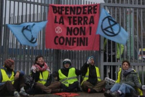 Extinction Rebellion blocca la convention della Difesa e dell’Aerospazio a Torino. “Difendere la Terra, non i confini”