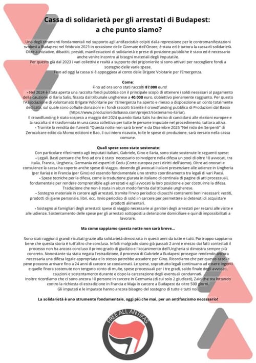 Free All ANTIFAS – Italy - Thursday, December 4, 2025Uno degli strumenti fondamentali nel supporto agli antifascisti/e colpiti dalla repressione per le contromanifestazioni svoltesi a Budapest nel febbraio 2023, in occasione delle Giornate dell’Onore, è stata ed è tuttora la cassa di solidarietà.