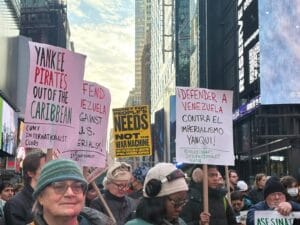 Qualche giorno fa è stata indetta una giornata nazionale di solidarietà al popolo venezuelano che si è tenuta sabato 6 dicembre in tutto il Paese. A New York City l’appuntamento era a Times Square: sotto i grattacieli ricoperti da mastodontici schermi su cui scorrono video di Babbo Natale che beve tutto contento la Coca Cola e di spiagge tropicali per una fuga a cinque stelle dallo stress moderno, si sono ritrovati attivisti ed esponenti della comunità latina; insieme a loro c’erano i giovani del movimento per la Palestina libera e  un buon numero di rappresentanti della storica comunità nera newyorkese (che per una volta hanno alzato l’età media dei partecipanti).