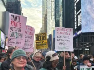 Qualche giorno fa è stata indetta una giornata nazionale di solidarietà al popolo venezuelano che si è tenuta sabato 6 dicembre in tutto il Paese. A New York City l’appuntamento era a Times Square: sotto i grattacieli ricoperti da mastodontici schermi su cui scorrono video di Babbo Natale che beve tutto contento la Coca Cola e di spiagge tropicali per una fuga a cinque stelle dallo stress moderno, si sono ritrovati attivisti ed esponenti della comunità latina; insieme a loro c’erano i giovani del movimento per la Palestina libera e un buon numero di rappresentanti della storica comunità nera newyorkese (che per una volta hanno alzato l’età media dei partecipanti).