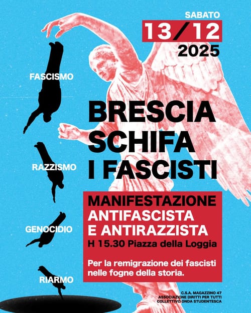 Da centro sociale autogestito Magazzino 47, Associazione Diritti per Tutti, Collettivo Onda Studentesca appello per una manifestazione antifascista e antirazzista sabato 13 dicembre in piazza della Loggia, a Brescia: