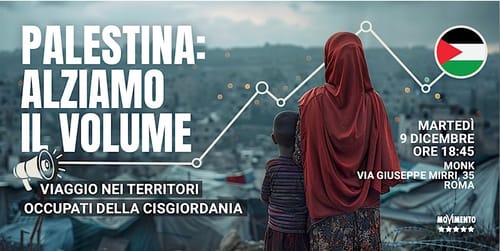 Domani 9 dicembre, dalle ore 18.45 al Monk di Roma in via Giuseppe Mirri 35, con la partecipazione del Presidente M5S Giuseppe Conte, si svolgerà l’iniziativa: “Palestina, alziamo il volume”. All’interno dell’evento i parlamentari – Stefania Ascari, Valentina Barzotti, Dario Carotenuto, Claudio Cominardi e Davide Tripiedi – racconteranno il loro viaggio nei territori occupati della Cisgiordania, insieme a Luisa Morgantini, che li ha accompagnati.  Tra gli ospiti anche il capogruppo M5S alla Camera Riccardo Ricciardi.
