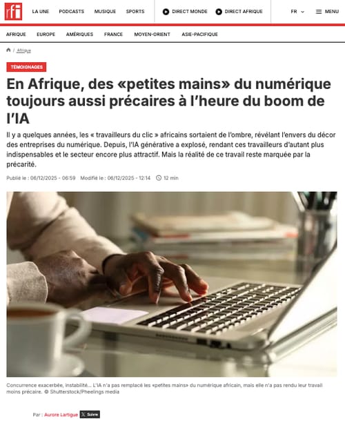 In a recent article on Radio France Internationale (RFI), to which DiPLab’s co-founder Antonio Casilli contributed on behalf of the research group, readers encounter detailed testimonies from AI’s data workers across Kenya, Nigeria, Egypt, Togo, Uganda, Ghana, and South Africa who have performed data annotation and AI-training tasks for companies such as Outlier, Appen, and Mindrift. These stories confirm a structural reality: while generative AI has exploded, it has made AI’s hidden labor more indispensable than ever. Moreover, the working conditions behind the scenes remain precarious.