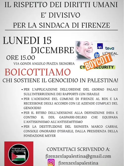 Firenze per la Palestina: presidio in Piazza della Signoria, lunedì 15/12 ore 15:00