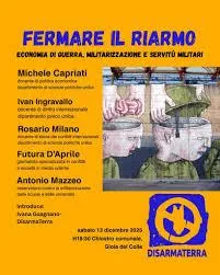 #Gioia del Colle (Bari), sabato 13 novembre, ore 18.30 - Fermare il Riarmo. Economia di #Guerra, #Militarizzazione e Servitù Militari - Intervengono: Michele Capriati, Ivan Ingravallo, Rosario Milano, Futura D'Aprile, Antonio Mazzeo. Introduce Ivana Guagnano.