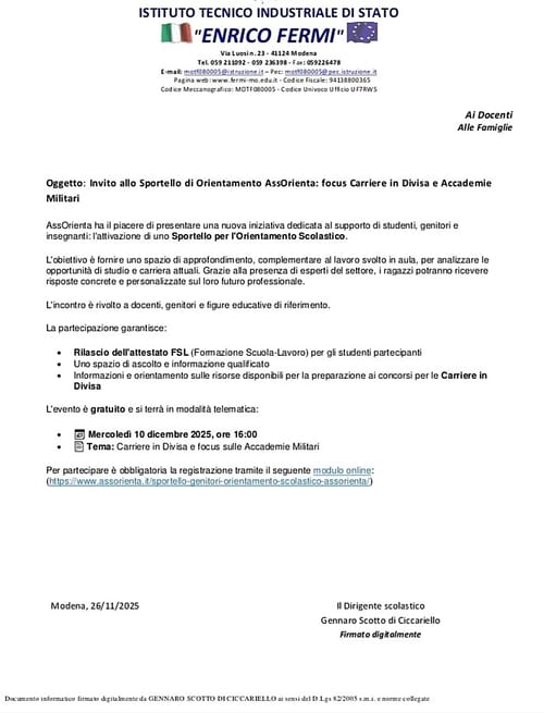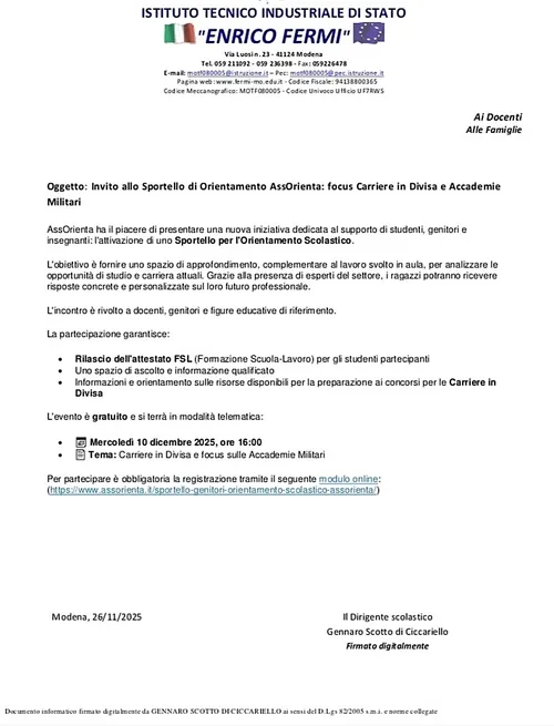Da Modena ci arriva una segnalazione sull’ITIS “Enrico Fermi”: il 26 novembre il dirigente scolastico ha scritto ai/le genitori degli/le studenti invitandolə a partecipare insieme ai/le loro figli/e al pomeriggio di orientamento con AssOrienta su carriere in divisa e accademie militari, il 10 dicembre.