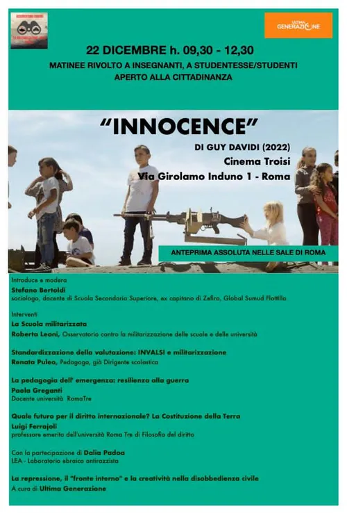 Su iniziativa dell’Osservatorio contro la militarizzazione delle scuole e delle università sarà proiettato in prima assoluta in una sala cinematografica a Roma il docufilm “Innocence” di del regista israeliano Guy Davidi. L’appuntamento è al Cinema Troisi il 22 dicembre alle 09:30, un matinée per tutte le scuole.