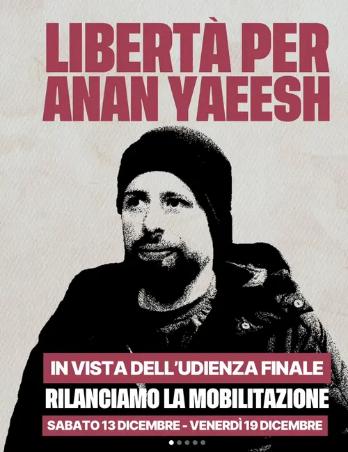 Radio Onda Rossa - Wednesday, December 10, 2025Il 19 dicembre, presso il Tribunale penale de L'Aquila, potrebbe chiudersi con una condanna il processo farsa sui prigionieri politici Anan, Ali e Mansour, che rischiano rispettivamente 12, 9 e 7 anni di carcere: molti di più rispetto a quelli che Anan ha scontato per fatti relativi alla seconda intifada.