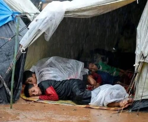 Almeno un milione le persone all’addiaccio, con tende o in ripari di fortuna sott’acqua, dove la pioggia si mescola alle acque di scarico, visto che il genocidio israeliano, oltre ad ammazzare più di 70 mila persone, ha scientificamente distrutto le condotte fognarie.