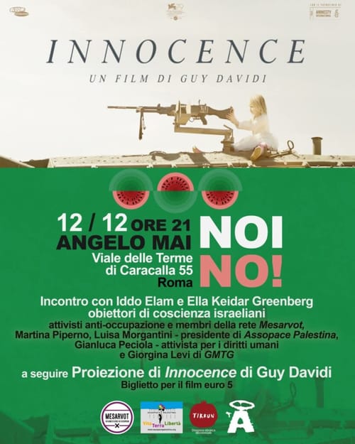 Venerdì 12 dicembre, ore 21:00, all’Angelo Mai, Viale Terme di Caracalla 55, Roma, si terrà un incontro con due obiettori di coscienza israeliani e interventi di Martina Piperno, Luisa Morgantini, Gianluca Peciola e Giorgina Levi. A seguire proiezione del film “Innocence” di Guy Davidi.