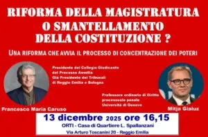Pressenza - Friday, December 12, 2025Il Movimento Agende Rosse – Rita Atria – di Reggio Emilia e Provincia annuncia un importante incontro pubblico sulla riforma costituzionale della magistratura, che si terrà sabato 13 dicembre alle ore 16:15 presso la Casa di Quartiere ‘L. Spallanzani’, in via Arturo Toscanini 20 a Reggio Emilia.