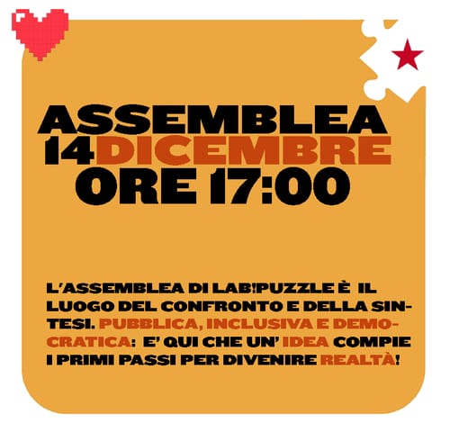 LABPUZZLE β Bene Comune - Friday, December 12, 2025π π’πππππππππL’assemblea di Lab!Puzzle Γ¨ libera, pubblica, democratica, antifascista, antisessista e antirazzista, prerogative che riteniamo indispensabili per il vivere civile ed un confronto sano. Si tiene ogni prima domenica del mese alle ore 17:00, salvo quando diversamente specificato. βοΈ ππππππ πππ ππππππ:L’odg si redige in mailing list ed Γ¨ in continuo aggiornamento. Per iscriversi occorre partecipare […]