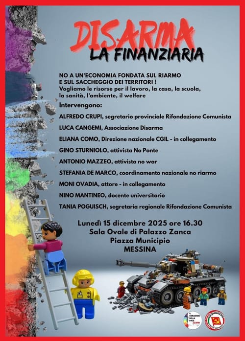 #Messina, lunedì 15 dicembre, ore 16.30. Disarma la finanziaria. No a un'economia fondata sul #riarmo e sul saccheggio dei territori. Vogliamo le risorse per il lavoro, la casa, la scuola, la sanità, l'ambiente, il welfare.