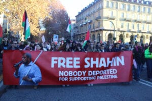Il corteo si è fermato in vari punti strategici, ad esempio davanti alla sede della Regione Piemonte, sottolineando l’incoerenza del Consiglio Regionale che ha rifiutato di discutere una mozione per chiudere tutte le collaborazioni con Israele, si è fermato davanti al Palazzo di Città, la sede del Consiglio comunale, per denunciare il fatto che il Comune nelle ultime due settimane non si è pronunciato rispetto all’arresto ed alla di Mohamed Shahin; a lui sono stati dedicati parte degli interventi lungo il corteo, chiedendone la liberazione immediata e il ritorno alla sua famiglia.