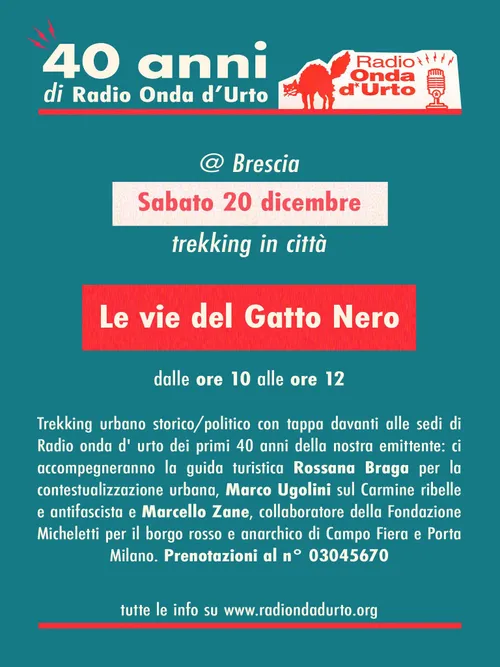Sabato 20 dicembre 2025 a Brescia trekking urbano, storico e politico con tappe davanti alle sedi storiche di Radio Onda d’Urto, per i primi 40 anni della nostra e vostra emittente, in compagnia di esperte ed esperti.