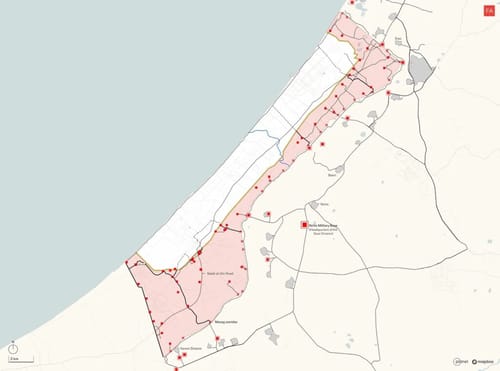 All’interno di Gaza, Israele mantiene attualmente 48 avamposti militari a est della linea gialla. Gli avamposti sono collegati a una rete di strade che sono state create, ampliate o appropriate dall’esercito israeliano. A loro volta, queste si collegano alle basi, alle strade e agli insediamenti israeliani al di fuori di Gaza.