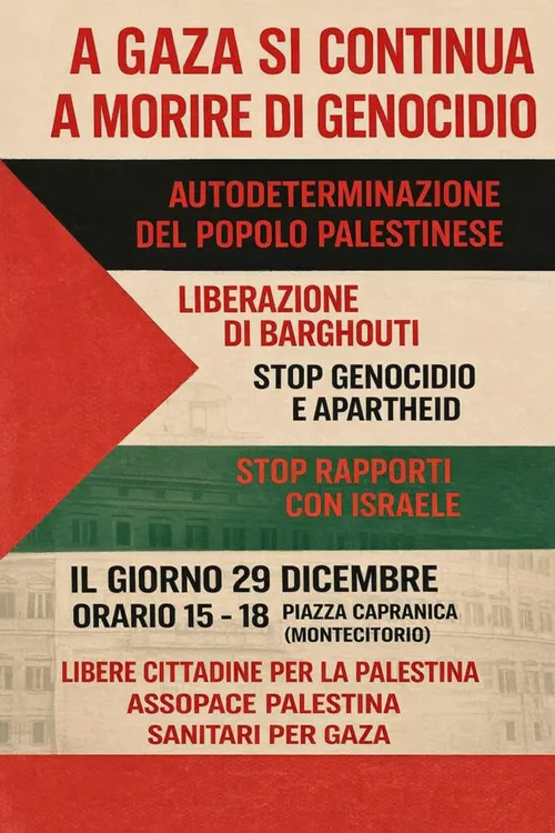 Lunedì 29 dicembre 2025, ore 15-18, in Piazza Capranica (Montecitorio) a Roma: Presidio per il popolo palestinese e per la liberazione di Marwan Barghouti.