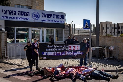 Attivisti di Standing Together protestano fuori dal quartier generale della polizia nazionale israeliana a Gerusalemme contro la crescente violenza criminale nelle comunità arabe, 23 novembre 2025. (Chaim Goldberg/Flash90)