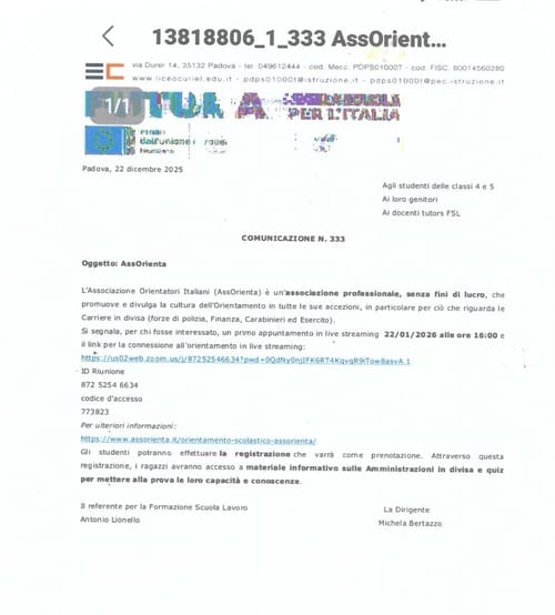 Nel profluvio quotidiano di segnalazioni, informative, notifiche di uscite anticipate o di scioperi in vista – sul quel strumento come minimo controverso che è il Registro Elettronico – ecco che appare, in data 22 dicembre 2025, una comunicazione “agli studenti delle classi 4 e 5, ai loro genitori e ai docenti tutor FSI”.