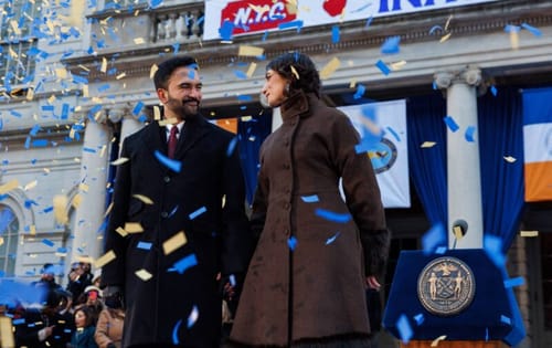 Quando il senatore del Vermont ha anche cercato di sottolineare che «chiedere ai ricchi e alle grandi aziende di iniziare a pagare la loro giusta quota di tasse» non era esattamente radicale – come Sanders ha spesso osservato altrove, sotto il presidente repubblicano Dwight Eisenhower l’aliquota fiscale marginale sui più ricchi americani era del 92% – la folla è esplosa in cori di «Tassate i ricchi!». Mamdani si è limitato a sorridere, ma come tutti quelli che potevano vedere uno dei tanti maxischermi intorno al municipio hanno potuto notare, sua moglie, Rama Duwaji, protetta dal freddo da quello che il New York Times ha descritto come un “cappotto di tendenza”, annuiva in segno di approvazione.