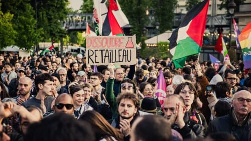 Contro lo scivolamento sempre più a destra del Governo francese – annunciando la richiesta di dissoluzione, il ministro dell’interno Retailleau ha scelto come palcoscenico il canale di estrema destra C-News – in Francia è in corso una mobilitazione di massa, sia nelle piazze – domenica 11 maggio in migliaia hanno sfilato a Parigi, unendo la lotta antirazzista a quella decoloniale e antifascista – che sul web: oltre 200mila le persone che hanno già firmato la petizione “Contro il genocidio, per una Palestina libera: no allo scioglimento di Urgence Palestine”.