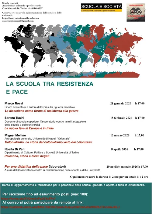 Osservatorio contro militarizzazione di scuole e università - Wednesday, January 7, 2026Corso di aggiornamento e formazione per il personale della scuola, aperto alla cittadinanza