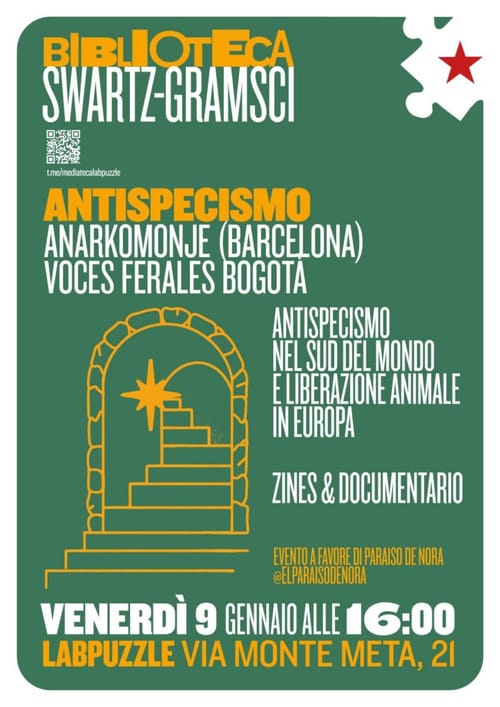 LABPUZZLE β Bene Comune - Thursday, January 8, 2026π VenerdΓ¬ 09/01 | dalle 16Biblioteca Swartz-Gramsci di Lab!Puzzle, via monte meta 21 Incontriamo @voces.ferales , progetto grafico ed editoriale nato a BogotΓ‘ che attraversa lβantispecismo come pratica politica, culturale e collettiva. Un percorso che promuove pensiero critico e azione, attivando spazi di agitazione, dialogo e organizzazione tra territori diversi, per condividere lotte, domande e […]