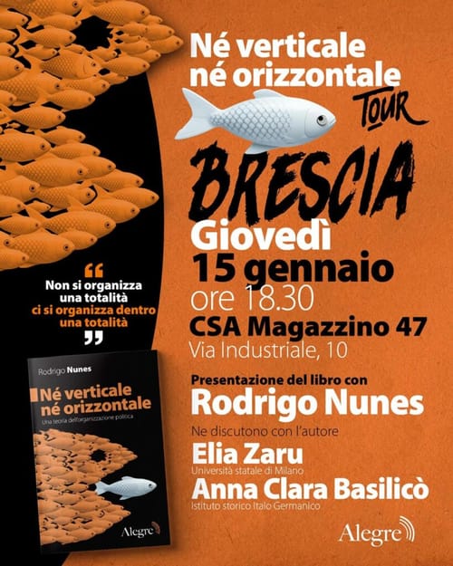 “Giovedì 15/01/2026 ore 18.30 C.S.A. Magazzino 47 – Brescia Presentazione del libro “Né verticale né orizzontale. Una teoria dell’organizzazione politica” (Ed. Alegre, 2025) con l’autore Rodrigo Nunes Discutono con l’autore: Elia Zaru (Università Statale di Milano) e Anna Clara Basilicò (Istituto Storico Italo Germanico). Rodrigo Nunes è professore di teoria politica presso l’Università di Essex nel Regno Unito e la Pontificia Università Cattolica di Rio de Janeiro (PUC-Rio) in Brasile. Oltre a questo libro, già pubblicato in diverse lingue, è autore di Organisation of the Organisationless: Collective Action after Networks (Mute, 2014), Do Transe à Vertigem: Ensaios sobre Bolsonarismo e um Mundo em Transição (Ubu, 2022) e di diversi articoli per pubblicazioni come Les Temps Modernes, Radical Philosophy, South Atlantic Quarterly, Jacobin e The Guardian. Viviamo in un’epoca in cui non mancano i movimenti sociali ma sono scomparse le organizzazioni di massa. In società sempre più atomizzate, in cui le identità collettive si sono rarefatte e dove i social network danno l’impressione a chiunque di potersi mobilitare senza doversi radicare in nessun luogo. L’idea stessa di organizzazione è diventata un “trauma”, a causa dei leaderismi e delle burocratizzazioni viste e riviste nel corso della storia. L’organizzazione ha però la doppia natura del pharmakon: è allo stesso tempo veleno e cura. Organizzarsi è infatti l’unico modo per permettere a chi non ha potere di espandere la propria capacità di agire in un mondo attraversato da enormi diseguaglianze e oppressioni. Per questo Rodrigo Nunes costruisce una nuova teoria dell’organizzazione politica, ridefinendo i termini del problema e liberando il campo dall’idea che esista una forma organizzativa – che sia un partito, un sindacato o un movimento – da replicare universalmente. Per decenni i dibattiti a sinistra hanno avuto la tendenza a fissare concetti contrapposti come orizzontalità e verticalità, differenza e unità, centralizzazione e decentramento, micropolitica e macropolitica come coppie disgiuntive che si escludono a vicenda: o l’una o l’altra. Nunes capovolge i presupposti abituali e propone di adottare una prospettiva ecologica, inquadrando la molteplicità delle strategie e delle organizzazioni come un ecosistema. Un approccio teorico che permette di valorizzare la cooperazione e la convergenza, e di sfruttare a proprio vantaggio la pluralità e l’eterogeneità dell’attuale fase politica e sociale. Durante l’iniziativa saranno disponibili le copie del libro”.