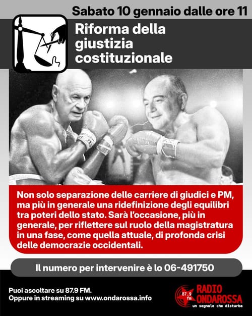 Radio Onda Rossa - Saturday, January 10, 2026In questo redazionale abbiamo provato a capire insieme i contenuti e i risvolti della riforma costituzionale della giustizia. Non solo separazione delle carriere di giudici e PM, ma più in generale una ridefinizione degli equilibri tra poteri dello stato. Riflettiamo sul ruolo della magistratura in una fase, come quella attuale, di profonda crisi delle democrazie occidentali.
