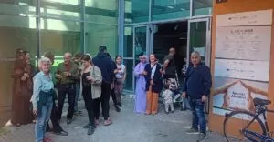 Si passa insieme tutto il pomeriggio, ci portano a fare un giro della palazzina, si fa anche uno striscione e lo si appende. La cosa incredibile è che a pochi metri dal loro ingresso rotto e fatiscente, ci sono un ufficio postale e una guardia medica, entrambe funzionanti, come se nulla fosse.
