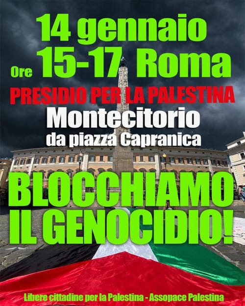 Mercoledì 14 gennaio, ore 15-17 a Montecitorio (piazza Capranica) si terrà il presidio “Blocchiamo il Genocidio” indetto da Libere cittadine per la Palestina e AssopacePalestina.