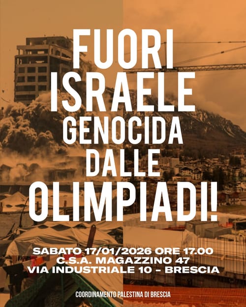 SABATO 17.01.26 – BRESCIA: FUORI ISRAELE DALLE OLIMPIADI! NON SI GIOCA CON IL GENOCIDIO. RITROVO H 17.00 AL C.S.A. MAGAZZINO 47″