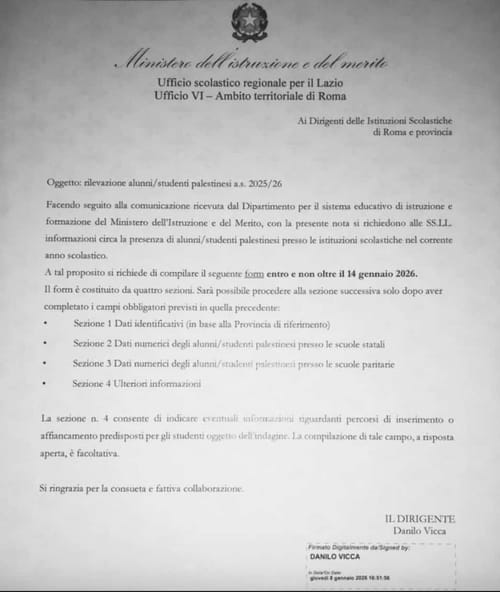 Osservatorio contro militarizzazione di scuole e università - Thursday, January 15, 2026Di inaudita gravità è la nota emanata in data 8 gennaio 2026 dall’Ufficio Scolastico Regionale per il Lazio – Ambito territoriale di Roma, con la quale si chiede alle scuole di rilevare alunni e alunne palestinesi iscritti per l’anno scolastico in corso.
