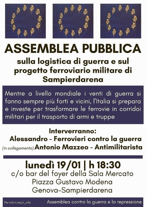 #Genova Sampierdarena - lunedì 19 gennaio ore 18,30 - Assemblea pubblica sulla logistica di #guerra e sul progetto ferroviario #militare di #Sampierdarena.