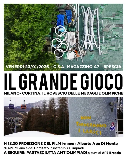 “IL GRANDE GIOCO: MILANO-CORTINA IL ROVESCIO DELLE MEDAGLIE OLIMPICHE”. VENERDI 23 GENNAIO LA PROIEZIONE AL CSA MAGAZZINO 47 DI BRESCIA