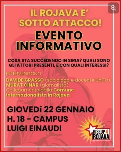 Dal 6 gennaio il governo ad interim siriano di al-Jolani (che ha guidato prima al Nusra e poi affiliato ad al Qaeda, ora a capo delle HTS) sta attaccando brutalmente la popolazione civile, prima nei quartieri curdi di Sheikh Maqsud e Ashrafiya ad Aleppo, poi nelle città di Tabqa e Raqqa, e da poche ore anche la città di Kobane. L’intento è eliminare la popolazione curda (dopo drusi e alawiti) e l’esperienza rivoluzionaria dell’Amministrazione Autonoma Democratica della Siria del Nord Est(DAANES), nei territori del Rojava (il Kurdistan siriano).