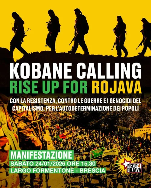 Dalla rete Rise Up 4 Rojava Brescia: “KOBANE CALLING: RISE UP 4 ROJAVA! Sabato 24 gennaio 2026 ore 15.30 Largo Formentone – Brescia. CON LA RESISTENZA, CONTRO LE GUERRE E I GENOCIDI DEL CAPITALISMO, PER L’AUTODETERMINAZIONE DEI POPOLI. Il confederalismo democratico in Siria è sotto attacco, scendiamo in piazza per difendere la rivoluzione!