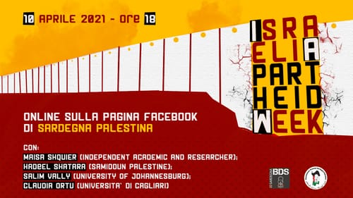 Sabato 10 aprile 2021 alle ore 18. Evento online in occasione della Israeli Apartheid Week, settimana dedicata alla sensibilizzazione sulla situazione di apartheid nella Palestina occupata. Intervengono: MAISA SHQUIER (Independent academic and researcher);HADEEL SHATARA (Samidoun Palestine);SALIM VALLY (University of Johannesburg);CLAUDIA ORTU (Università di Cagliari). In diretta sulla pag. FB di Sardegna Palestina