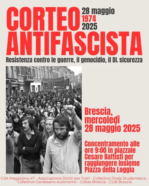 Il corteo autonomo del 28 Maggio, a 51 anni dalla Strage fascista, di Stato e della Nato, è organizzato alle ore 9 da piazzale Battisti (uscita metro San Faustino) per andare collettivamente in corteo in piazza Loggia, dove alle ore 10.12 del mattino del 28 Maggio 1974 esplose la bomba che uccise 8 compagne e compagni, ferendone oltre un centinaio, durante una manifestazione antifascista.