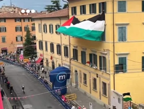 Grande mobilitazione ieri, durante il passaggio della tappa del Giro d’Italia che collegava Lucca a Pisa, in sostegno alla causa palestinese.